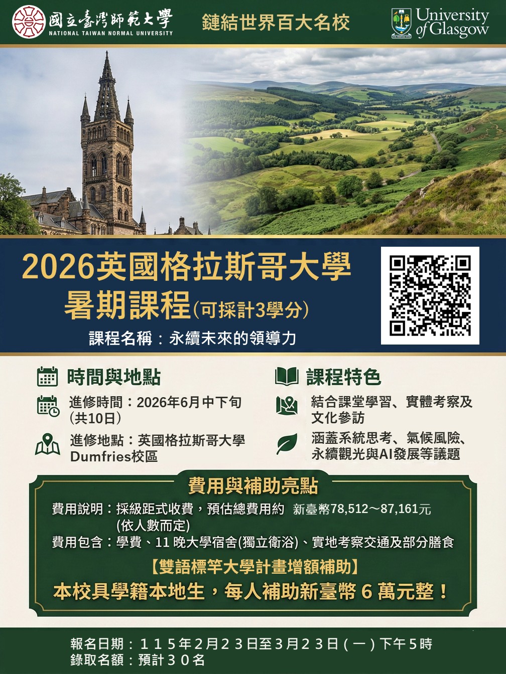 臺師大與格拉斯哥大學(2026年QS排名全球第79名)合作,推出專為臺師大學生設計的暑期課程。