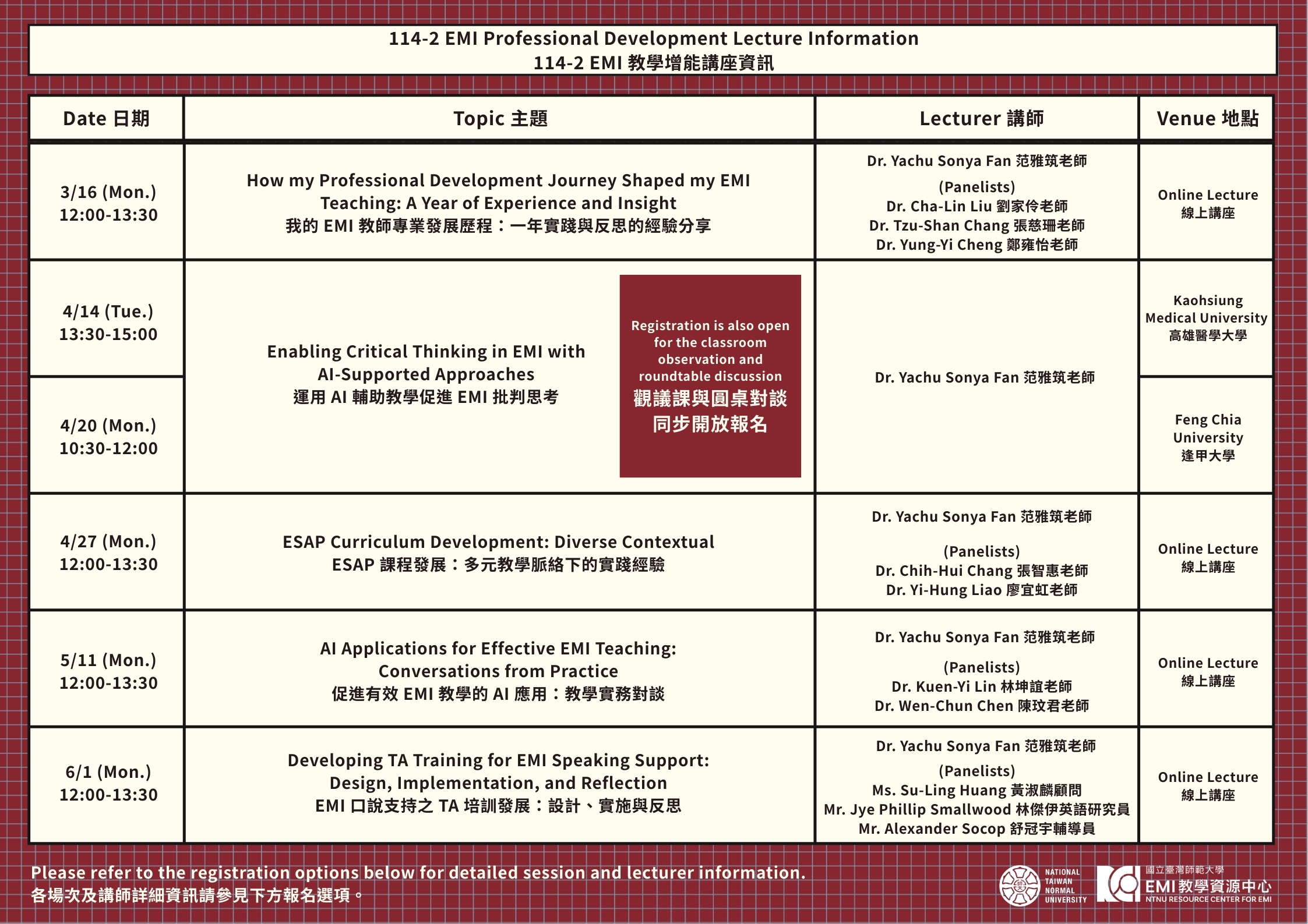 114-2學期EMI教學資源中心將舉辦四場線上講座及兩場實體講座,日期分別為3月16日、4月14日、4月20日、4月27日、5月11日及6月1日,講座資訊如下: