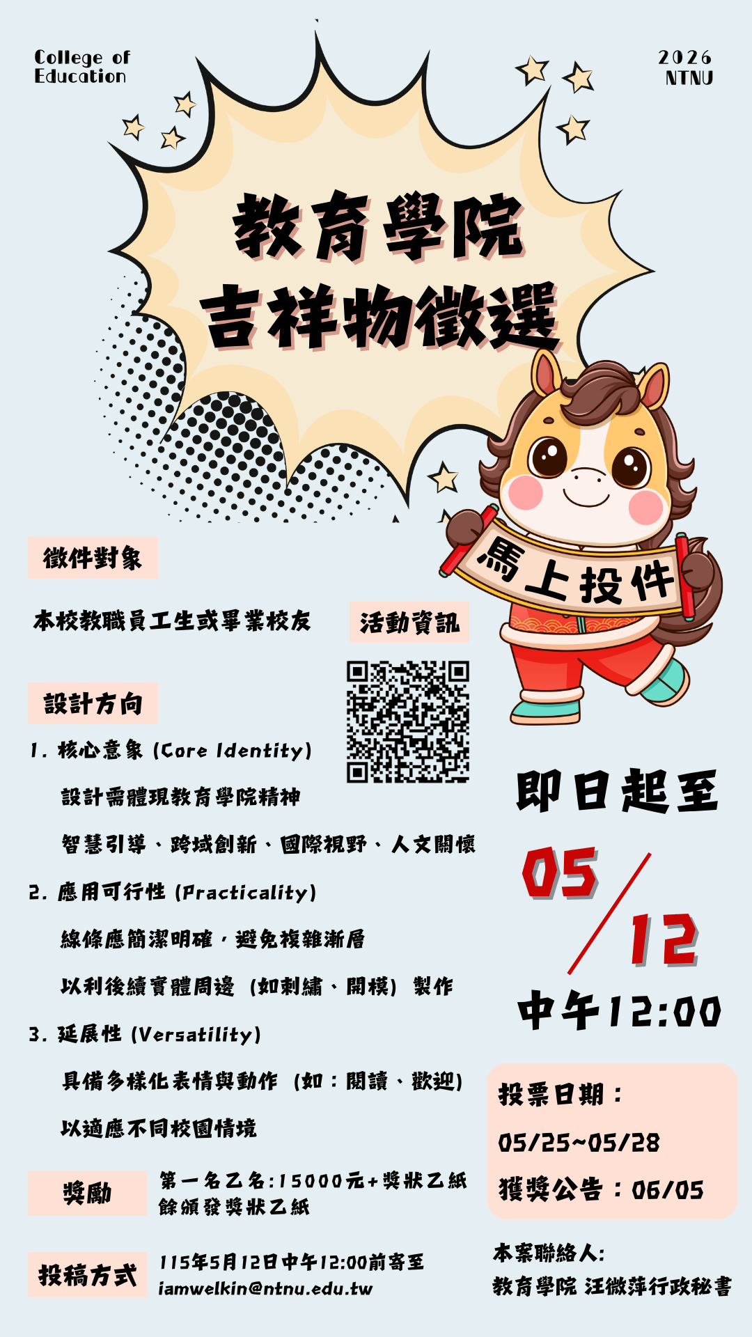 【轉知】教育學院吉祥物徵選,歡迎踴躍參加! 為強化教育學院視覺品牌形象,並展現「引領教育創新、培育卓越人才」之核心精神,特舉辦吉祥物設計徵選。 本計畫目標為創作出兼具專業感與親和力之形象大使,以利後續應用於院級文宣、社群媒體、國際交流贈品,以及各項實體周邊用品(如文具、服飾、生活小物等)之開發。 徵選第一名之作品頒發獎金15000元!(註:獲獎所得獎金須依照中華民國所得稅法規定,預扣所得稅。) Post author:CISS office Post published:2026-03-12