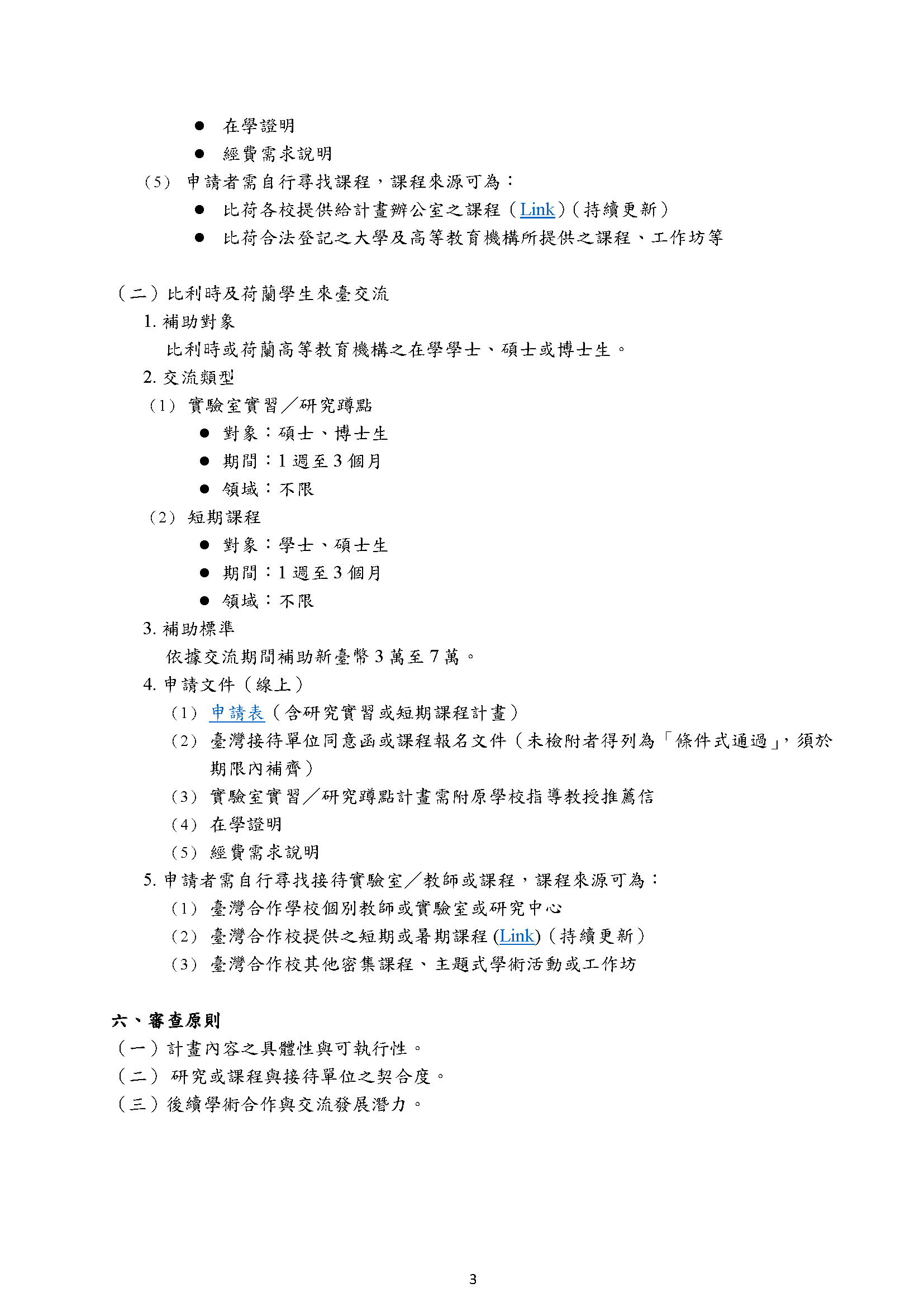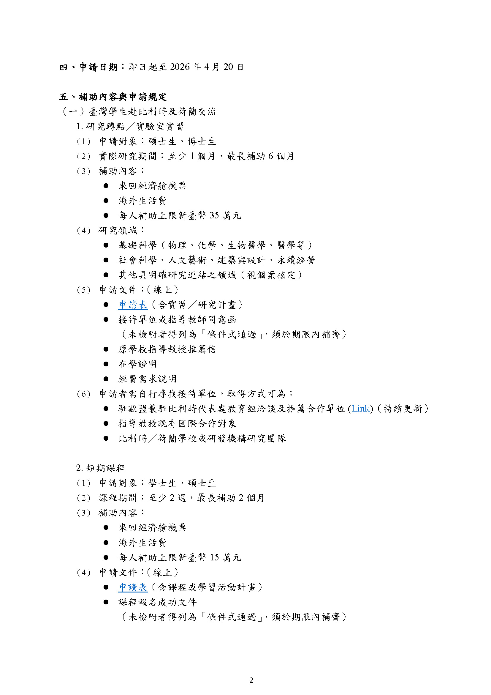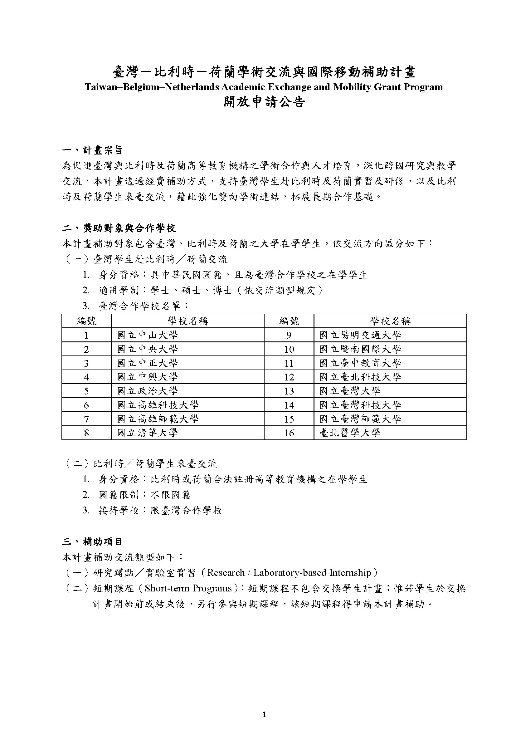同時公開徵求本校有意接待比利時或荷蘭學生之教師或院系所,提供研究實習機會或開設短期課程。