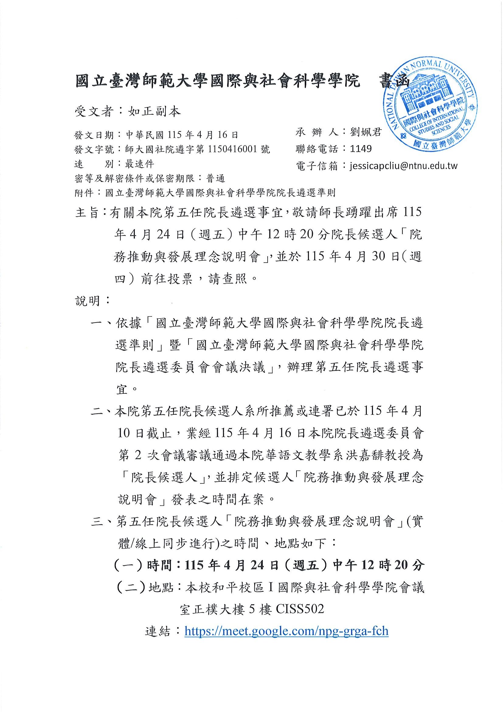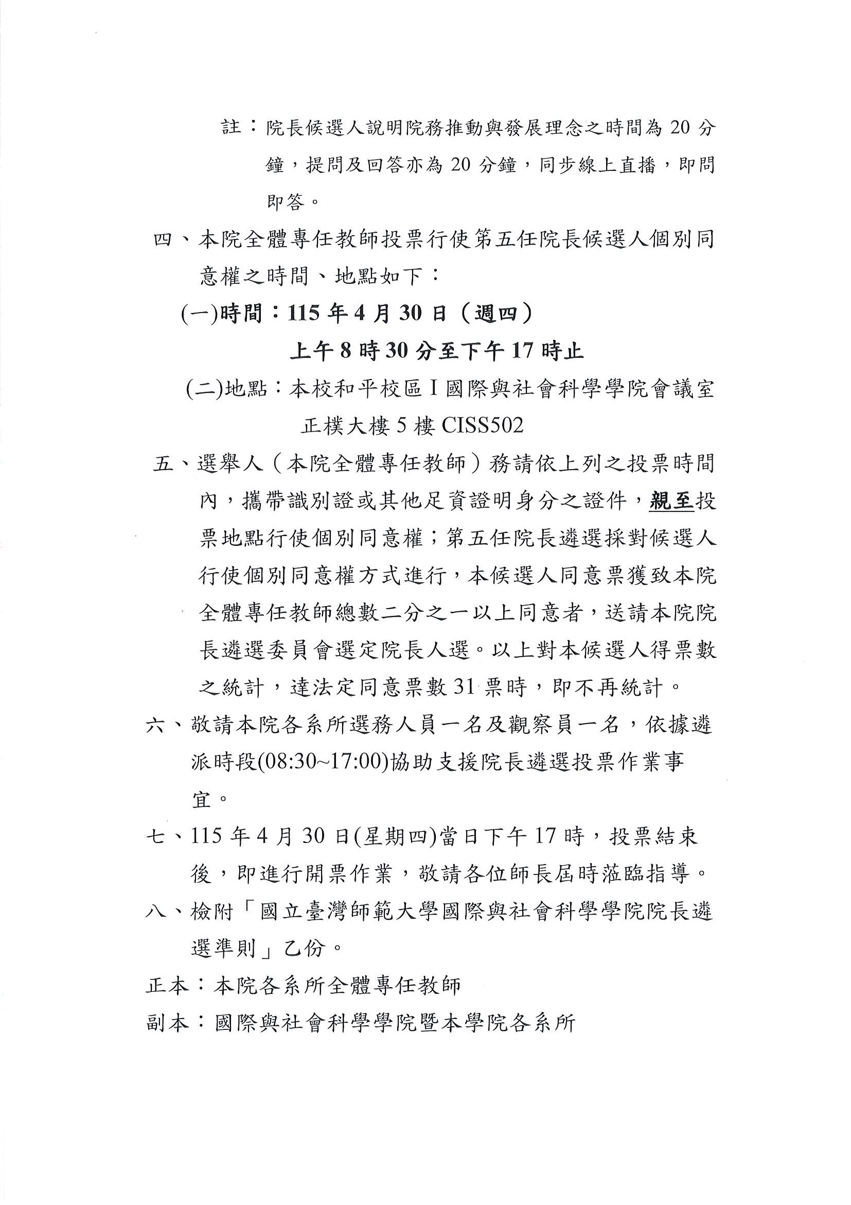 主旨:有關本院笫五任院長遴選事宜,敬請本院師長踴躍出席115年4月24日(週五)中午12時20分院長候選人「院務推動與發展理念說明會」,並於115年4月30日(週四)前往投票,請查照。
