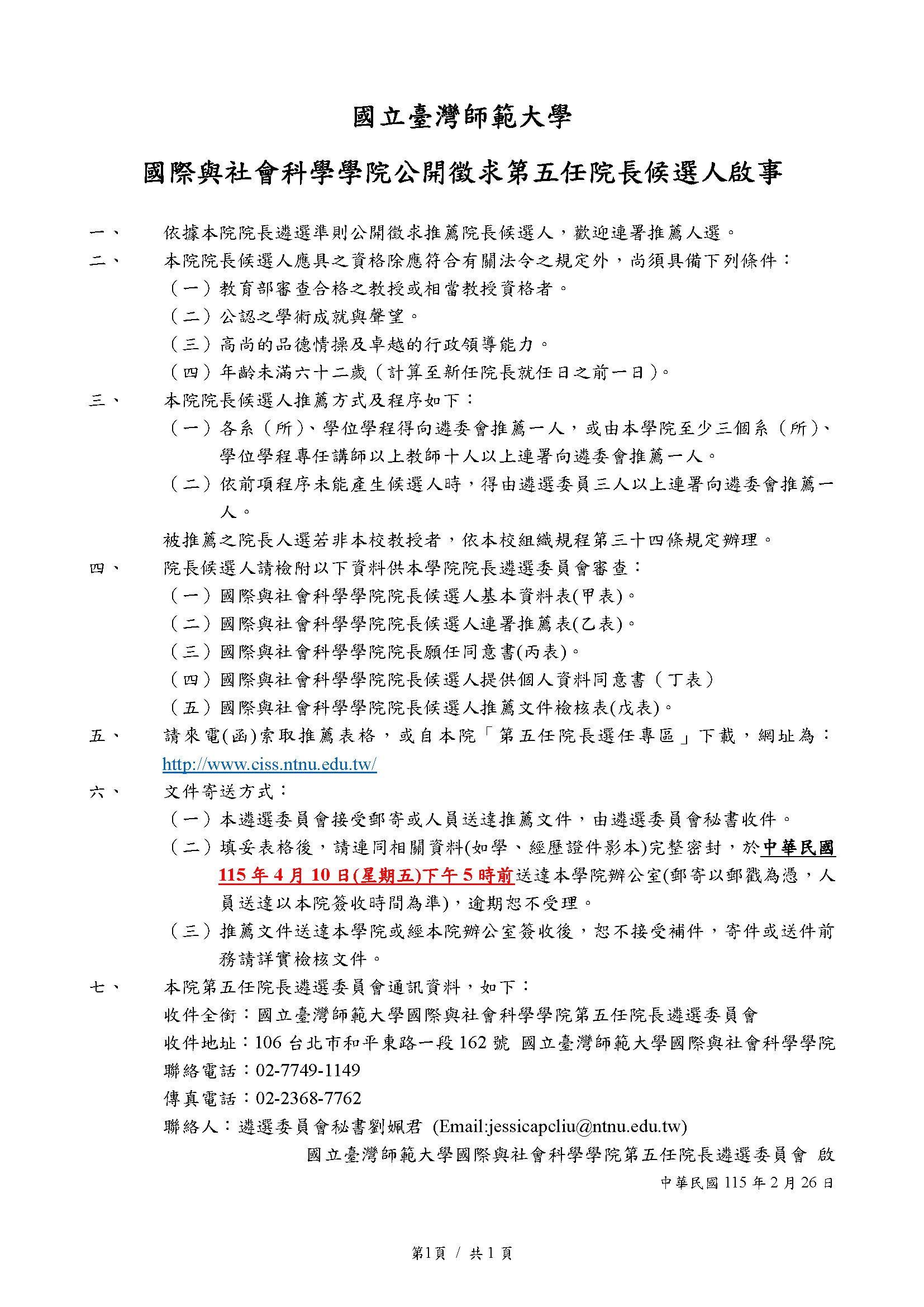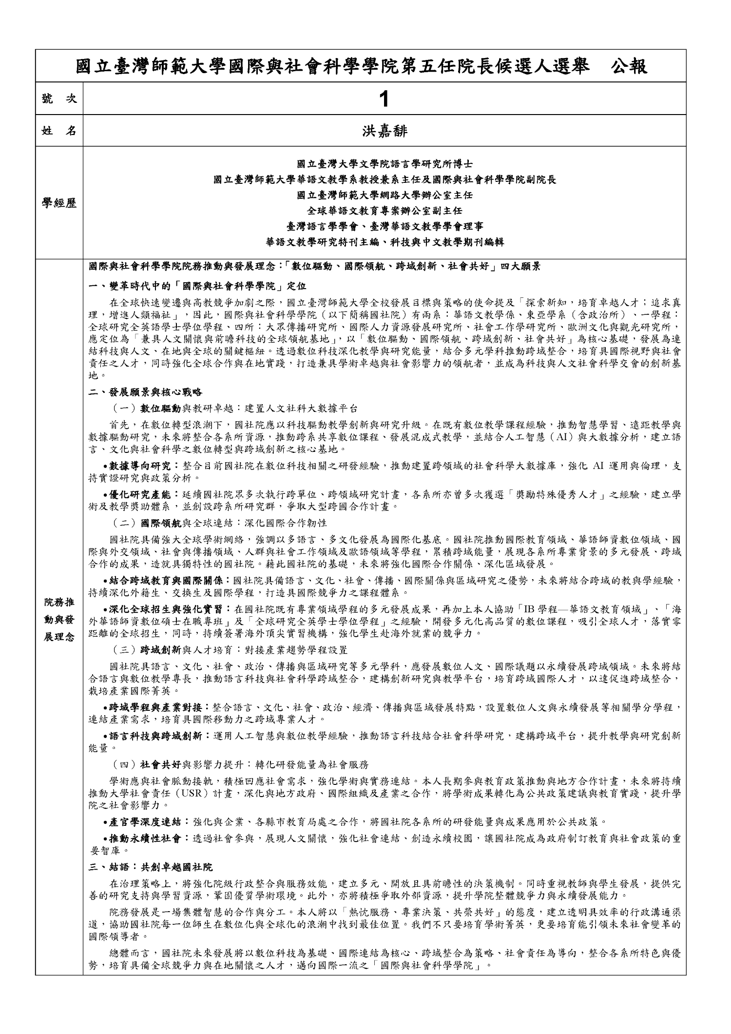 | 第五任院長遴選 院長遴選候選人名單 院長候選人選舉公報 候選人個別同意權選票 院長遴選結果公告 遴選工作項目及預定時間表1 遴選工作項目及預定時間表2 公開徵求院長候選人啟事 院長遴選相關法規及表單下載 國社院院長遴選準則 院長遴選作業要點 國社院第五任院長遴選預定時間表 國際與社會科學學院公開徵求第五任院長候選人啟事 甲表-國社院院長候選人資料表 乙表-國社院院長候選人推薦連署表 丙表-國社院院長願任同意書 丁表-國社院院長候選人提供個人資料同意書 戊表-國社院院長候選人推薦文件檢核表 院長遴選歷任資料 第四任院長遴選 第三任院長遴選 第二任院長遴選